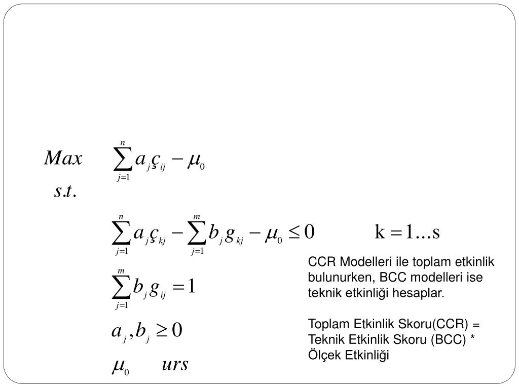 CCR Modelleri ile toplam etkinlik bulunurken, BCC modelleri ise teknik etkinliği hesaplar. Toplam Etkinlik Skoru(CCR) = Teknik Etkinlik Skoru (BCC) * Ölçek Etkinliği