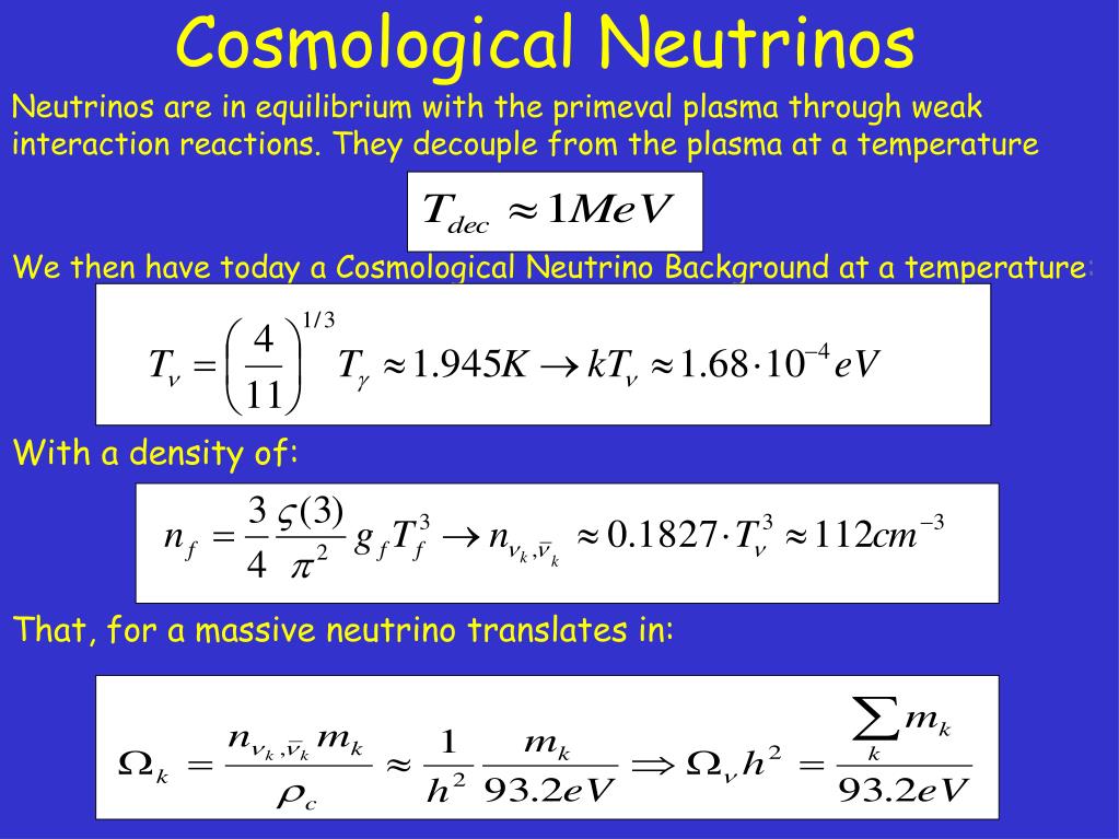 Cosmological Neutrinos Neutrinos are in equilibrium with the primeval plasma through weak interaction reactions. They decouple from the plasma at a temperature We then have today a Cosmological Neutrino Background at a temperature: With a density of: That, for a massive neutrino translates in: