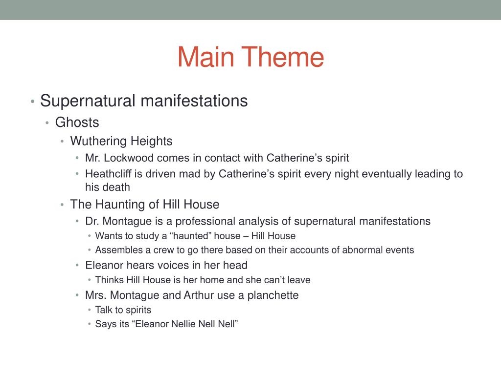 Main Theme • Supernatural manifestations • Ghosts • Wuthering Heights • Mr. Lockwood comes in contact with Catherine’s spirit • Heathcliff is driven mad by Catherine’s spirit every night eventually leading to his death • The Haunting of Hill House • Dr. Montague is a professional analysis of supernatural manifestations • Wants to study a “haunted” house – Hill House • Assembles a crew to go there based on their accounts of abnormal events • Eleanor hears voices in her head • Thinks Hill House is her home and she can’t leave • Mrs. Montague and Arthur use a planchette • Talk to spirits • Says its “Eleanor Nellie Nell Nell”