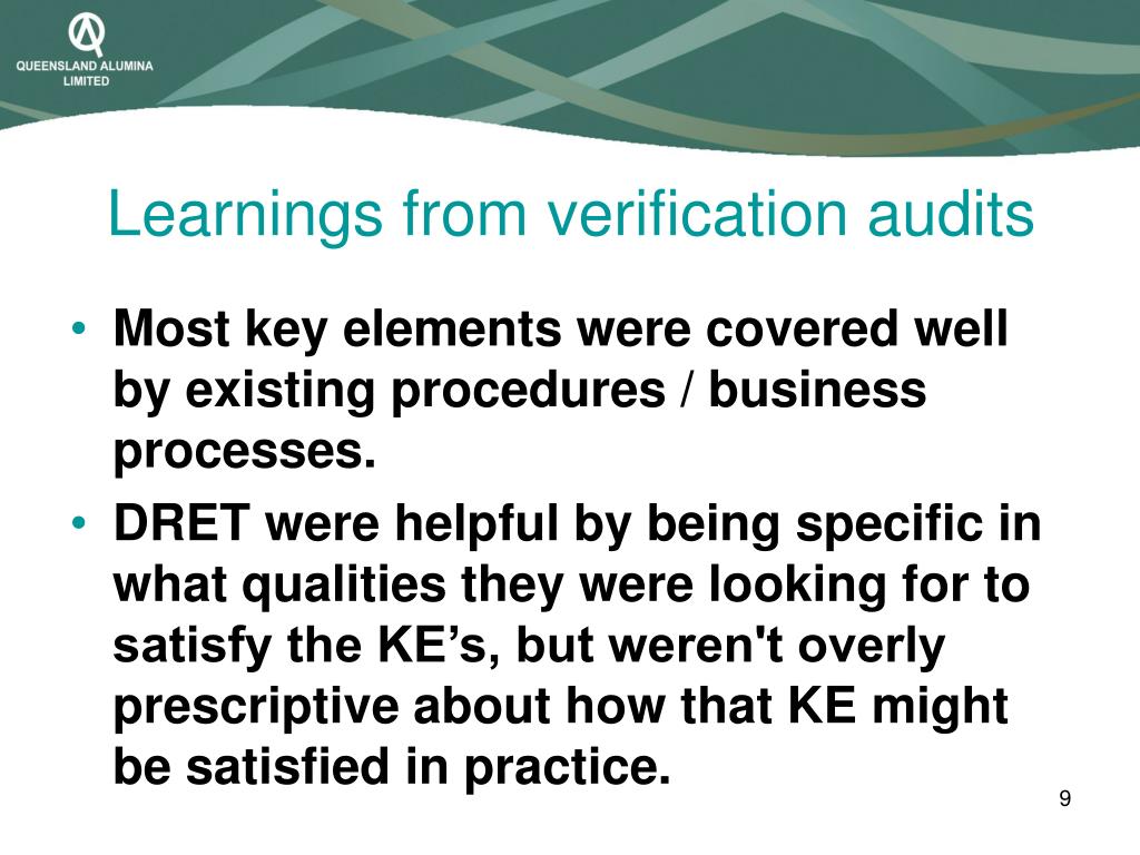 Learnings from verification audits • Most key elements were covered well by existing procedures / business processes. • DRET were helpful by being specific in what qualities they were looking for to satisfy the KE’s, but weren't overly prescriptive about how that KE might be satisfied in practice.