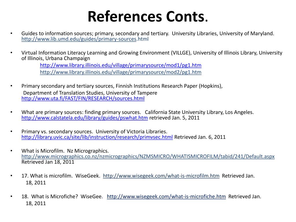 References Conts. • Guides to information sources; primary, secondary and tertiary. University Libraries, University of Maryland. http://www.lib.umd.edu/guides/primary-sources.html • Virtual Information Literacy Learning and Growing Environment (VILLGE), University of Illinois Library, University of Illinois, Urbana Champaign http://www.library.illinois.edu/village/primarysource/mod1/pg1.htm http://www.library.illinois.edu/village/primarysource/mod2/pg1.htm • Primary secondary and tertiary sources, Finnish Institutions Research Paper (Hopkins), Department of Translation Studies, University of Tampere http://www.uta.fi/FAST/FIN/RESEARCH/sources.html • What are primary sources: finding primary sources. California State University Library, Los Angeles. http://www.calstatela.edu/library/guides/pswhat.htm retrieved Jan. 5, 2011 • Primary vs. secondary sources. University of Victoria Libraries. http://library.uvic.ca/site/lib/instruction/research/primvsec.html Retrieved Jan. 6, 2011 • What is Microfilm. Nz Micrographics. http://www.micrographics.co.nz/nzmicrographics/NZMSMICRO/WHATISMICROFILM/tabid/241/Default.aspxRetrieved Jan 18, 2011 • 17. What is microfilm. WiseGeek. http://www.wisegeek.com/what-is-microfilm.htmRetrieved Jan. 18, 2011 • 18. What is Microfiche? WiseGee. http://www.wisegeek.com/what-is-microfiche.htm Retrieved Jan. 18, 2011