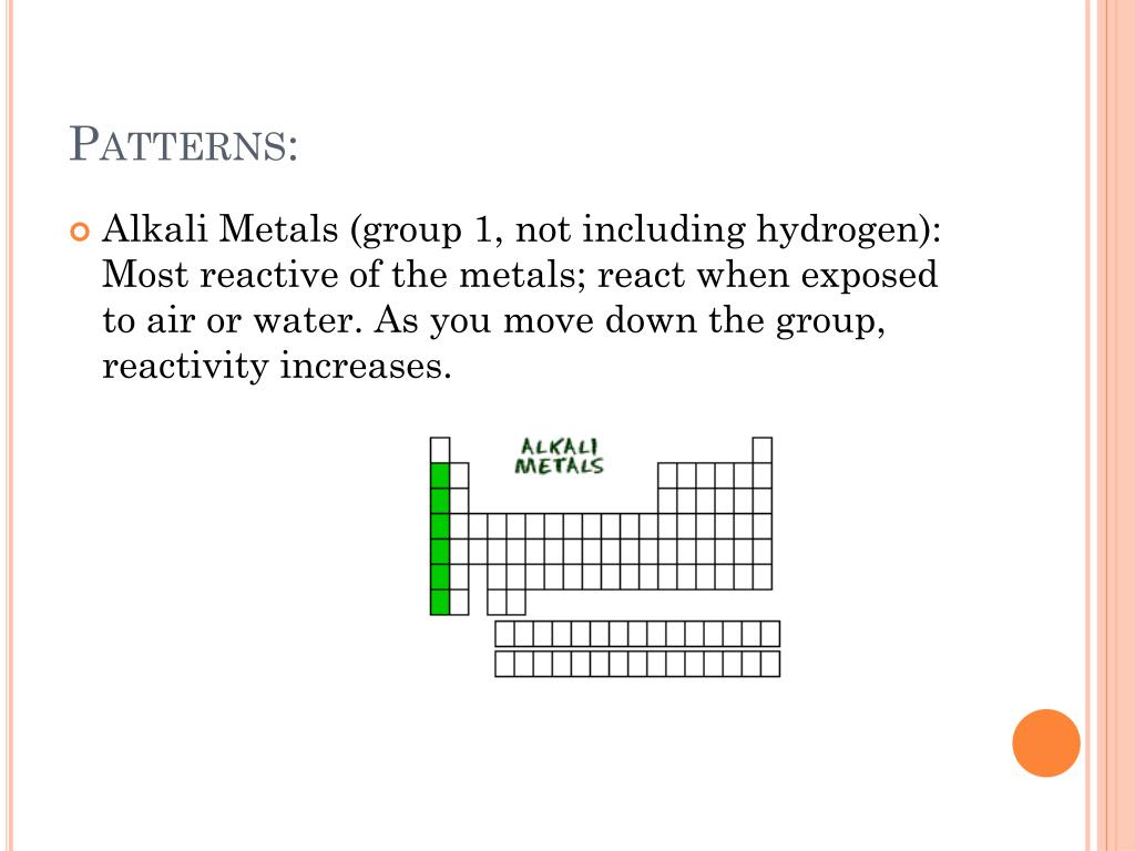 Patterns: • Alkali Metals (group 1, not including hydrogen): Most reactive of the metals; react when exposed to air or water. As you move down the group, reactivity increases.