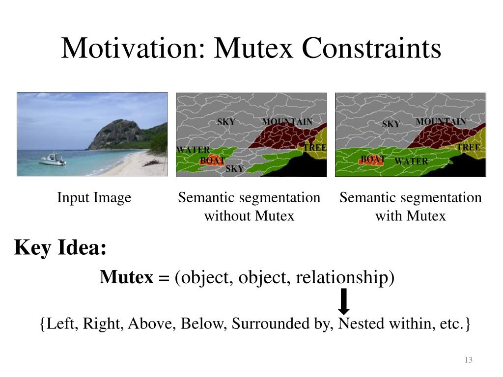Motivation: Mutex Constraints Input Image Semantic segmentation without Mutex Semantic segmentation with Mutex {Left, Right, Above, Below, Surrounded by, Nested within, etc.} Key Idea: Mutex= (object, object, relationship)