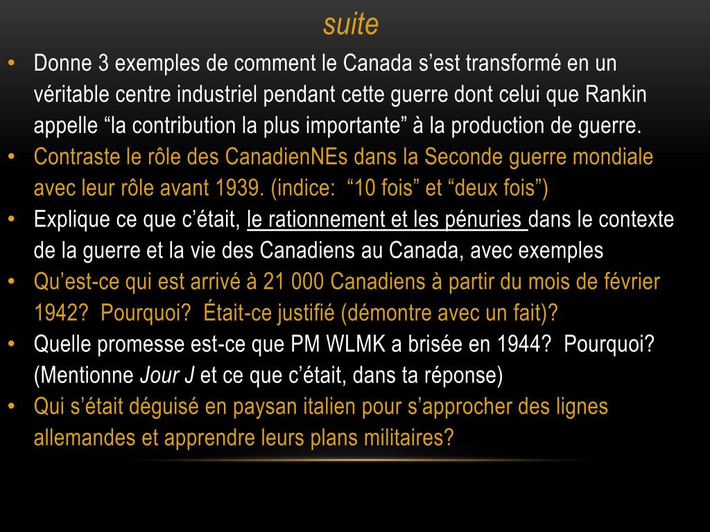 suite • Donne 3 exemples de comment le Canada s’est transformé en un véritable centre industriel pendant cette guerre dont celui que Rankin appelle “la contribution la plus importante” à la production de guerre. • Contraste le rôle des CanadienNEs dans la Seconde guerre mondiale avec leur rôle avant 1939. (indice: “10 fois” et “deux fois”) • Explique ce que c’était, le rationnement et les pénuries dans le contexte de la guerre et la vie des Canadiens au Canada, avec exemples • Qu’est-ce qui est arrivé à 21 000 Canadiens à partir du mois de février 1942? Pourquoi? Était-ce justifié (démontre avec un fait)? • Quelle promesse est-ce que PM WLMK a brisée en 1944? Pourquoi? (Mentionne Jour J et ce que c’était, dans ta réponse) • Qui s’était déguisé en paysan italien pour s’approcher des lignes allemandes et apprendre leurs plans militaires?