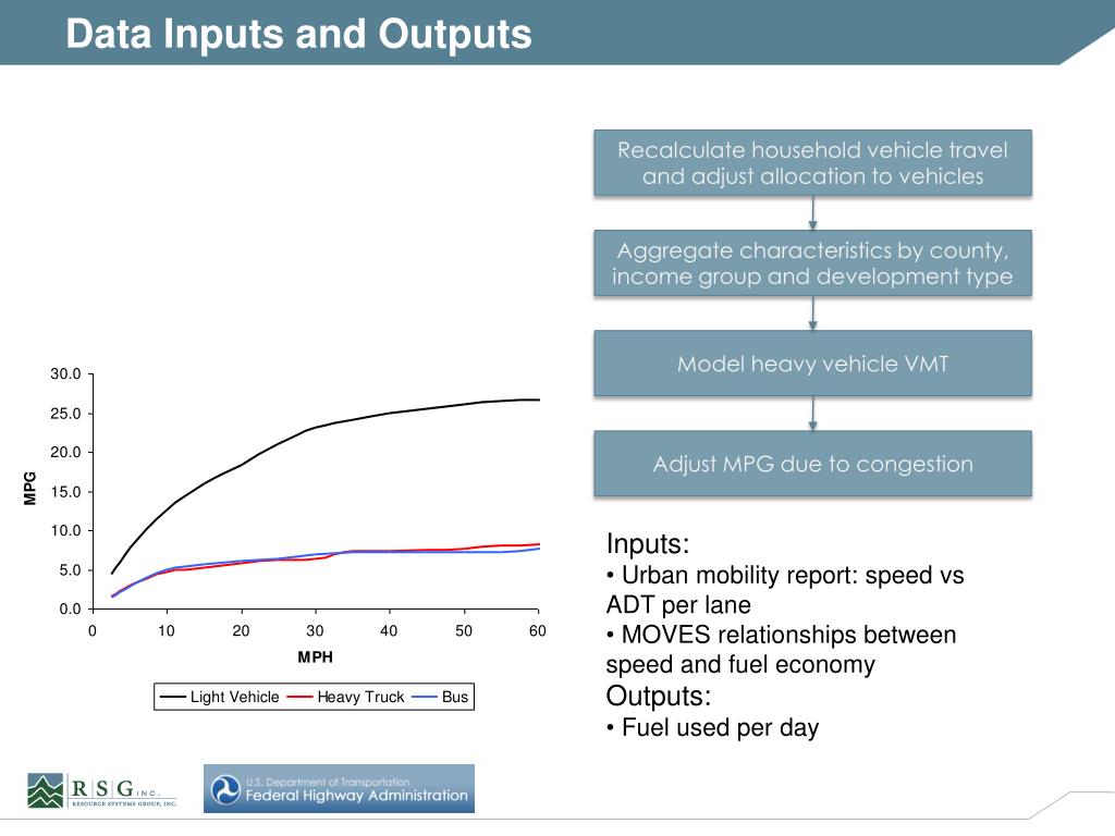 Data Inputs and Outputs Recalculate household vehicle travel and adjust allocation to vehicles Aggregate characteristics by county, income group and development type Model heavy vehicle VMT Adjust MPG due to congestion • Inputs: • Urban mobility report: speed vs ADT per lane • MOVES relationships between speed and fuel economy • Outputs: • Fuel used per day