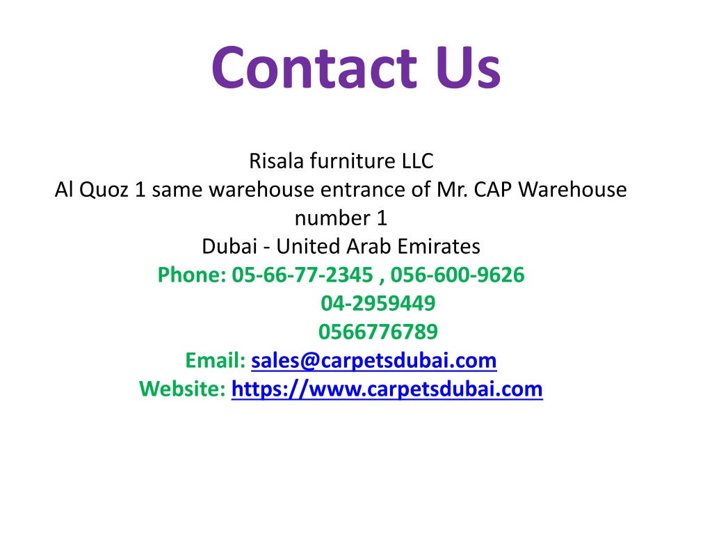 Contact Us Risala furniture LLCAl Quoz 1 same warehouse entrance of Mr. CAP Warehouse number 1Dubai - United Arab Emirates Phone: 05-66-77-2345 , 056-600-9626 04-2959449 0566776789Email: sales@carpetsdubai.com Website: https://www.carpetsdubai.com