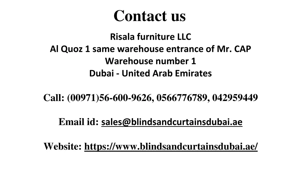 Risala furniture LLCAl Quoz 1 same warehouse entrance of Mr. CAP Warehouse number 1Dubai - United Arab Emirates Call: (00971)56-600-9626, 0566776789, 042959449 Email id: sales@blindsandcurtainsdubai.ae Website: https://www.blindsandcurtainsdubai.ae/ Contact us