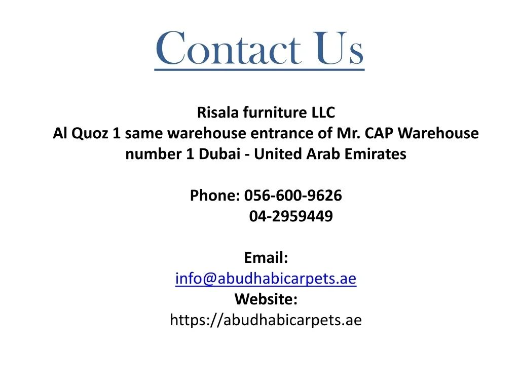 Contact Us Risala furniture LLC Al Quoz 1 same warehouse entrance of Mr. CAP Warehouse number 1 Dubai - United Arab Emirates Phone: 056-600-9626 04-2959449Email: info@abudhabicarpets.ae Website: https://abudhabicarpets.ae