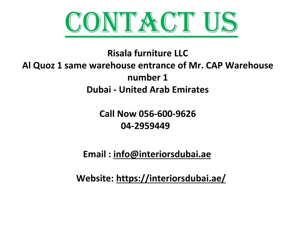 Contact Us Risala furniture LLCAl Quoz 1 same warehouse entrance of Mr. CAP Warehouse number 1Dubai - United Arab Emirates Call Now 056-600-962604-2959449 Email : info@interiorsdubai.ae Website: https://interiorsdubai.ae/