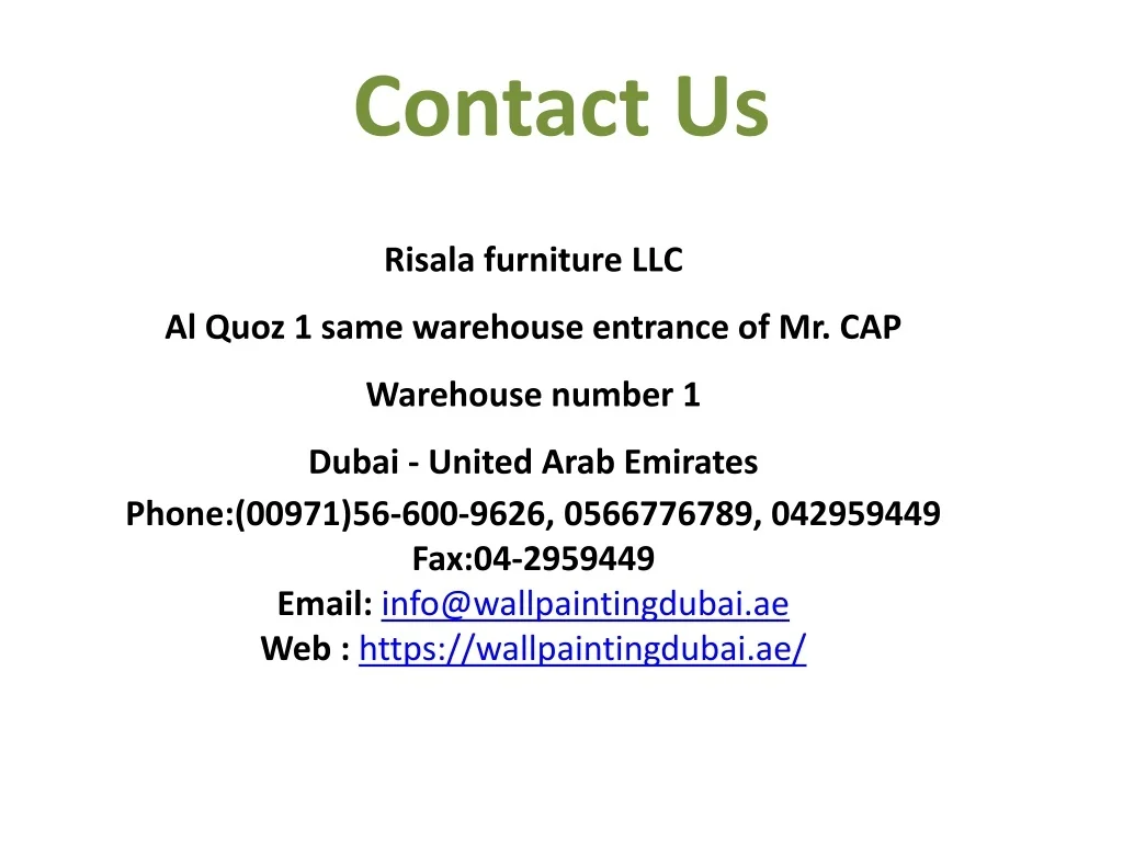 Contact Us Risala furniture LLCAl Quoz 1 same warehouse entrance of Mr. CAP Warehouse number 1Dubai - United Arab Emirates Phone:(00971)56-600-9626, 0566776789, 042959449 Fax:04-2959449 Email: info@wallpaintingdubai.ae Web : https://wallpaintingdubai.ae/