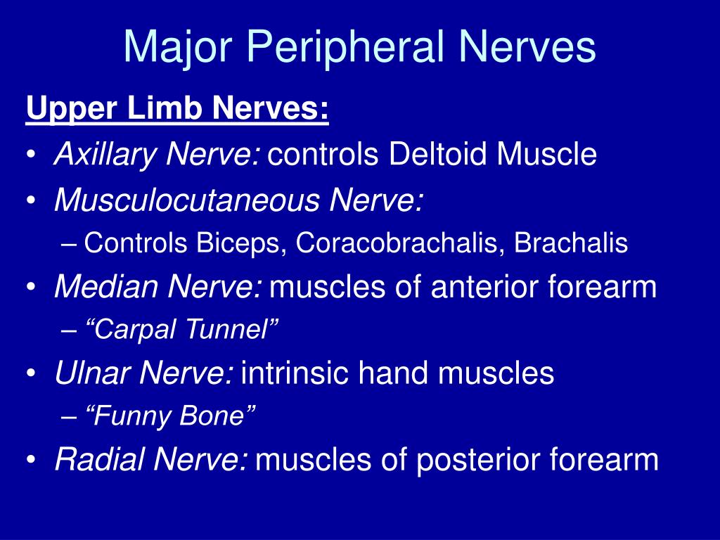 Major Peripheral Nerves Upper Limb Nerves: • Axillary Nerve: controls Deltoid Muscle • Musculocutaneous Nerve: • Controls Biceps, Coracobrachalis, Brachalis • Median Nerve: muscles of anterior forearm • “Carpal Tunnel” • Ulnar Nerve: intrinsic hand muscles • “Funny Bone” • Radial Nerve: muscles of posterior forearm