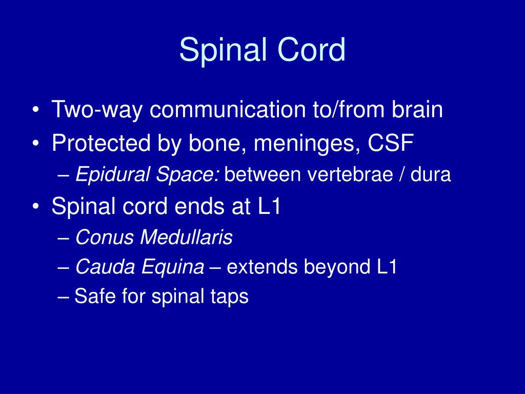 Spinal Cord • Two-way communication to/from brain • Protected by bone, meninges, CSF • Epidural Space: between vertebrae / dura • Spinal cord ends at L1 • Conus Medullaris • Cauda Equina – extends beyond L1 • Safe for spinal taps