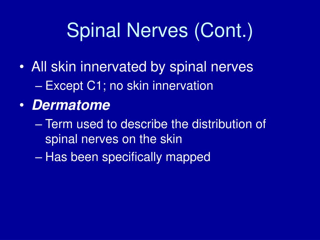 Spinal Nerves (Cont.) • All skin innervated by spinal nerves • Except C1; no skin innervation • Dermatome • Term used to describe the distribution of spinal nerves on the skin • Has been specifically mapped