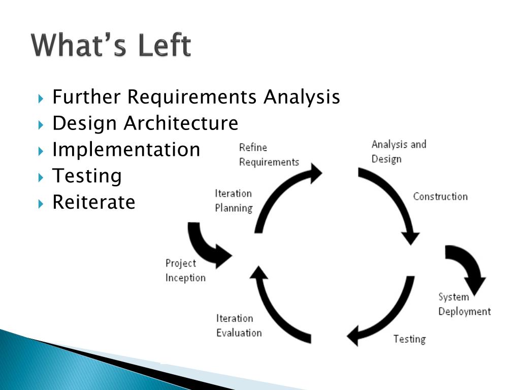 What’s Left • Further Requirements Analysis • Design Architecture • Implementation • Testing • Reiterate