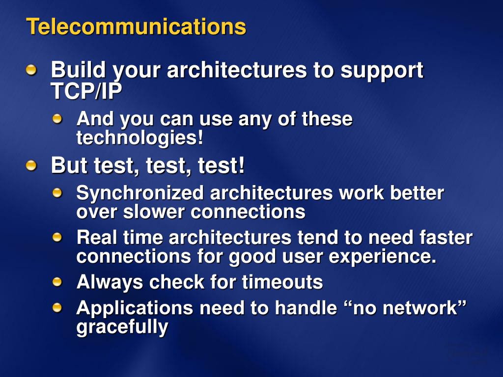 Telecommunications • Build your architectures to support TCP/IP • And you can use any of these technologies! • But test, test, test! • Synchronized architectures work better over slower connections • Real time architectures tend to need faster connections for good user experience. • Always check for timeouts • Applications need to handle “no network” gracefully