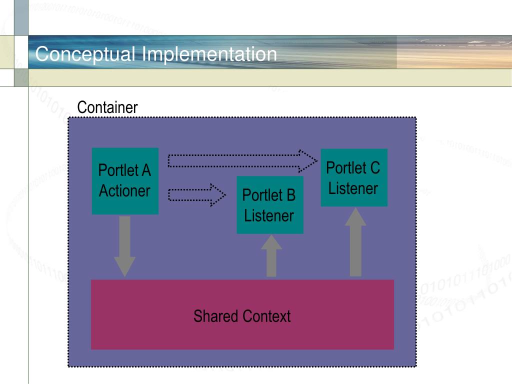 Container Portlet C Listener Portlet A Actioner Portlet B Listener Shared Context Conceptual Implementation