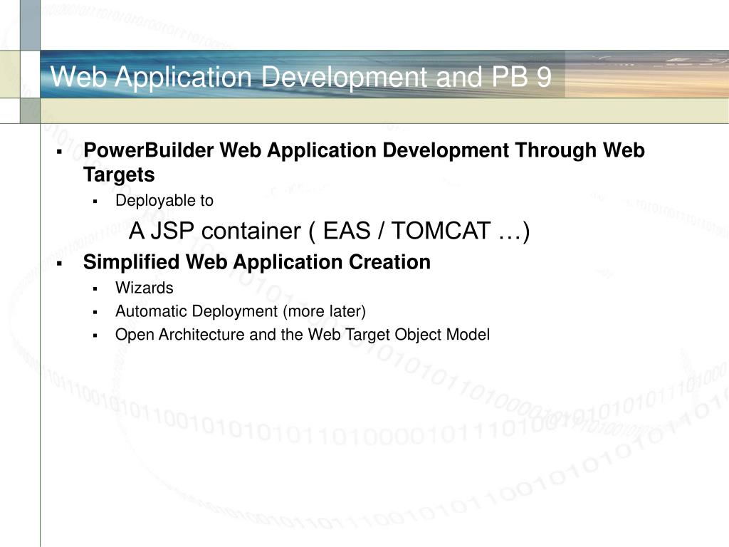 Web Application Development and PB 9 • PowerBuilder Web Application Development Through Web Targets • Deployable to • A JSP container ( EAS / TOMCAT …) • Simplified Web Application Creation • Wizards • Automatic Deployment (more later) • Open Architecture and the Web Target Object Model