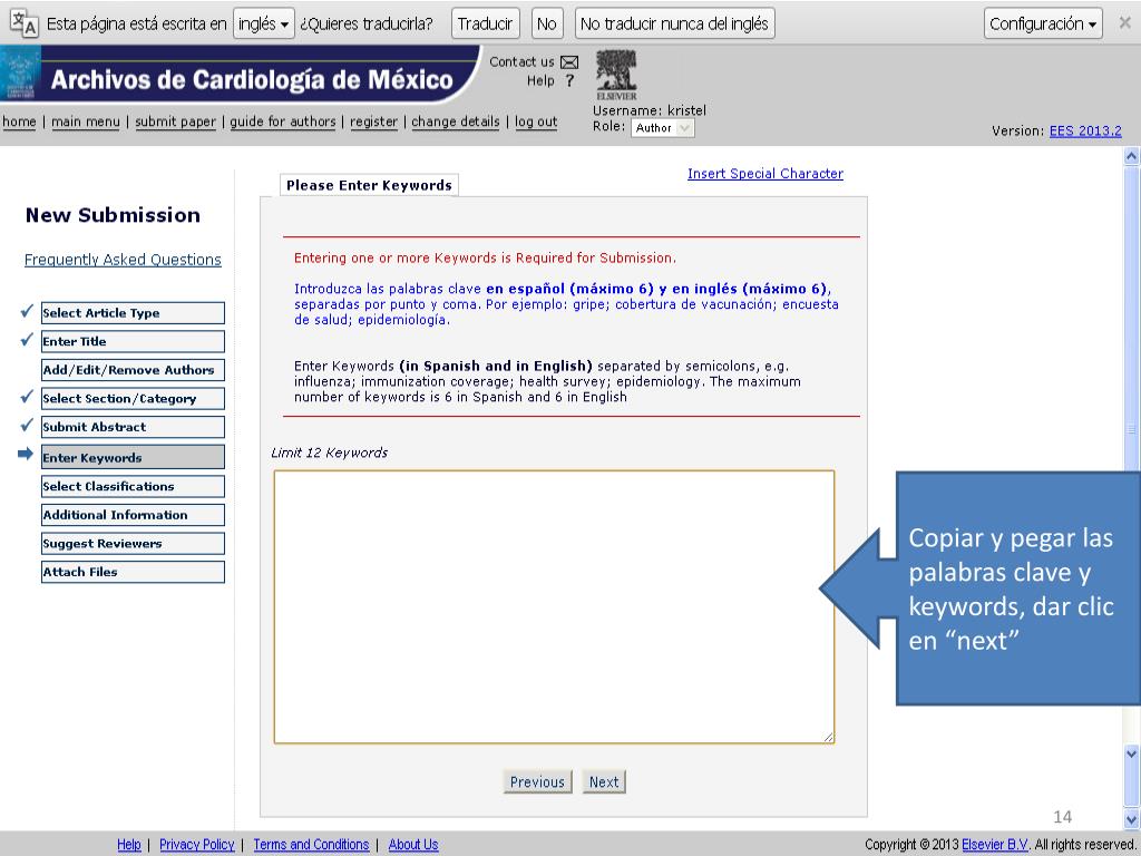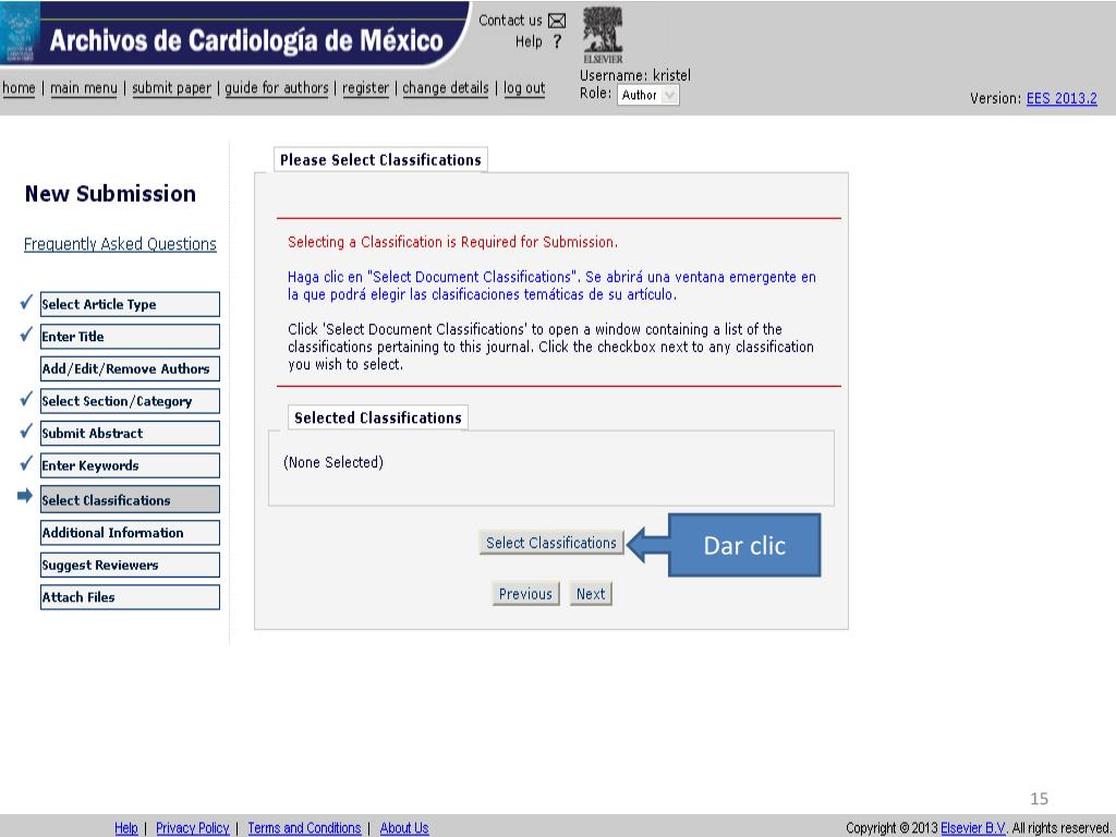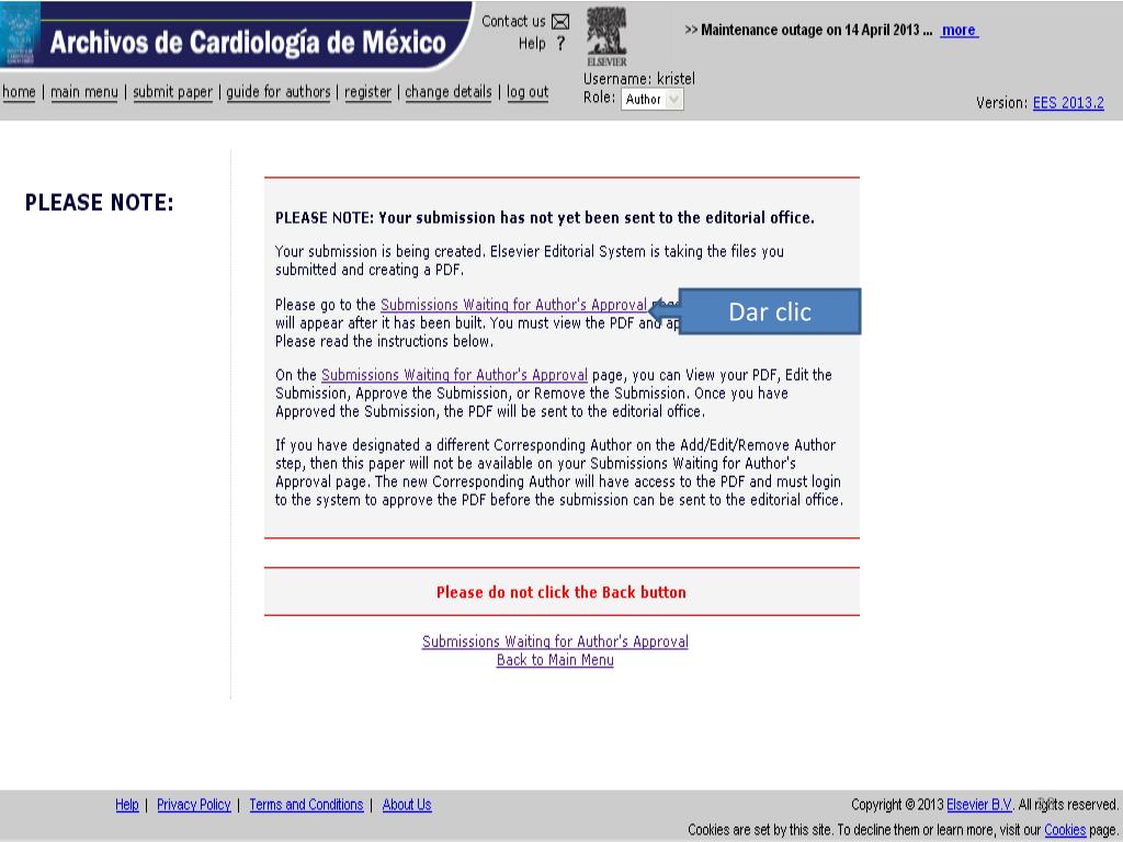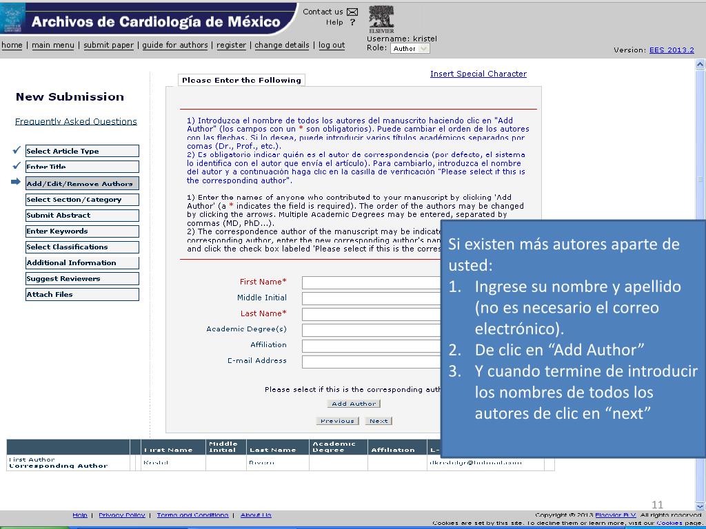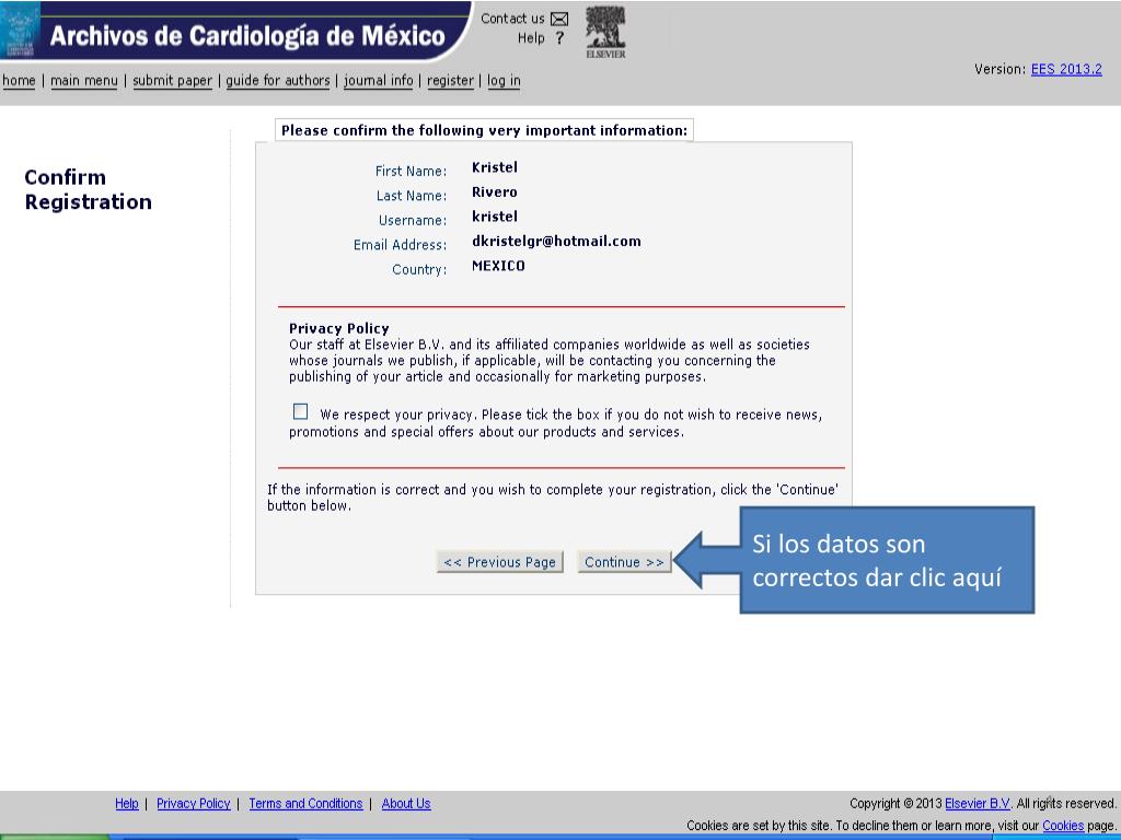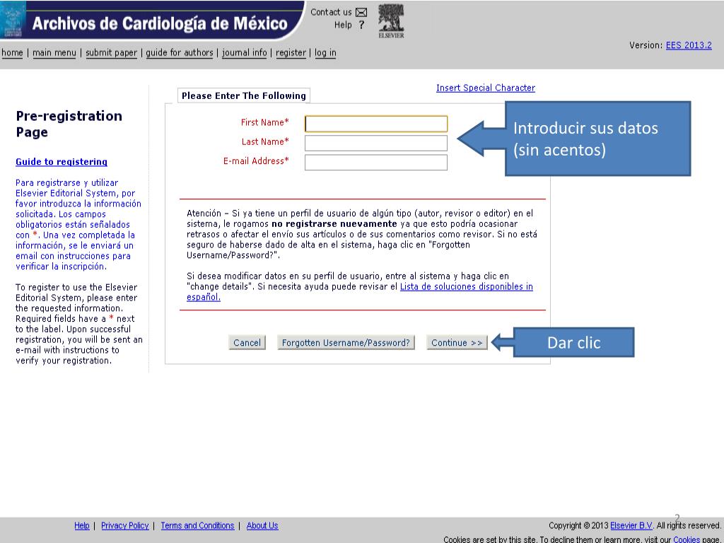 ¿Nuevo autor?, dar clic en “ Register ”. http://ees.elsevier.com/acmx/. Introducir sus datos (sin acentos). Dar clic. Llenar los datos solicitados en rojo y al final de la página dar “ submit ”. Si los datos son correctos dar clic aquí.