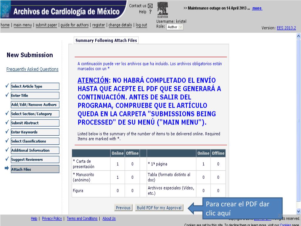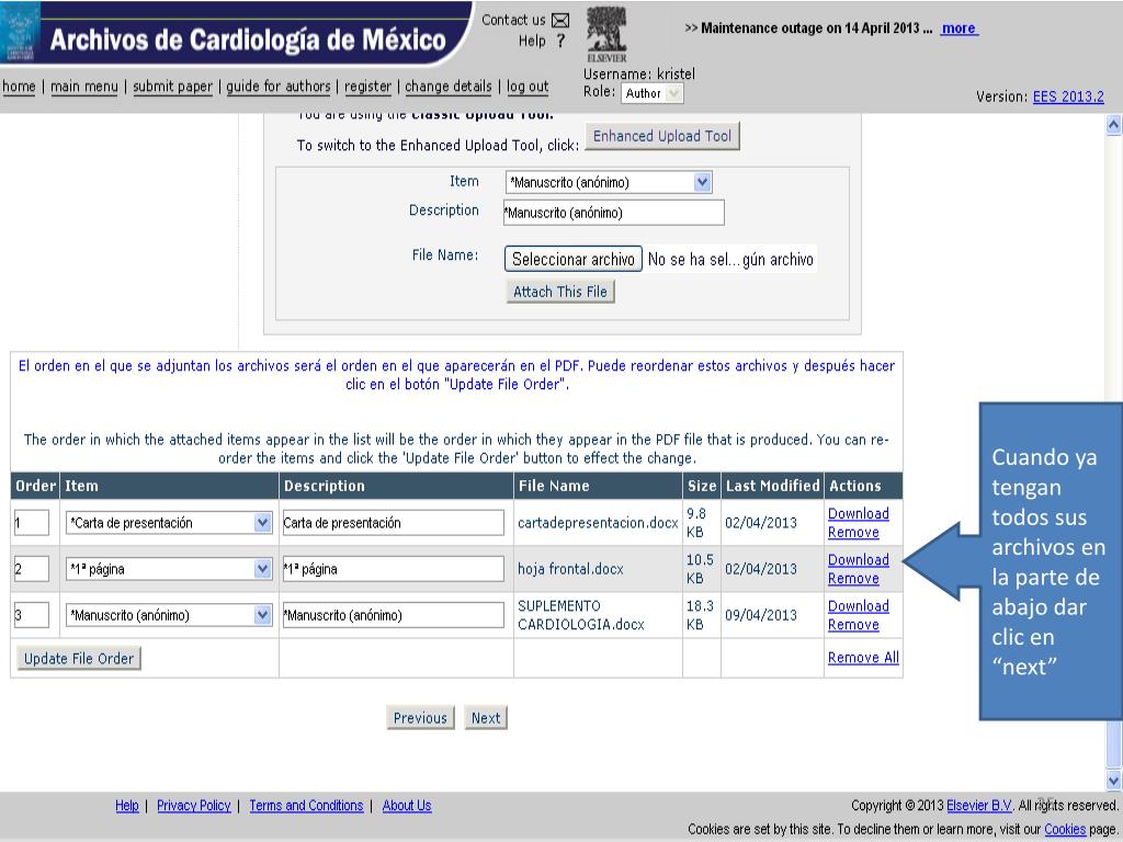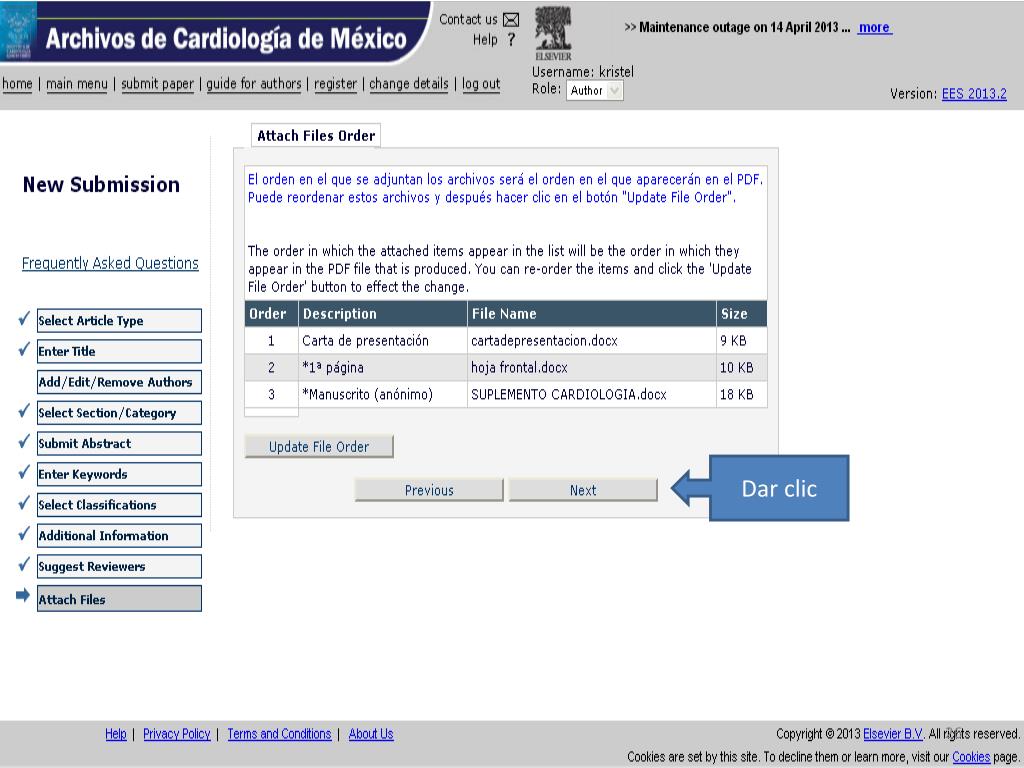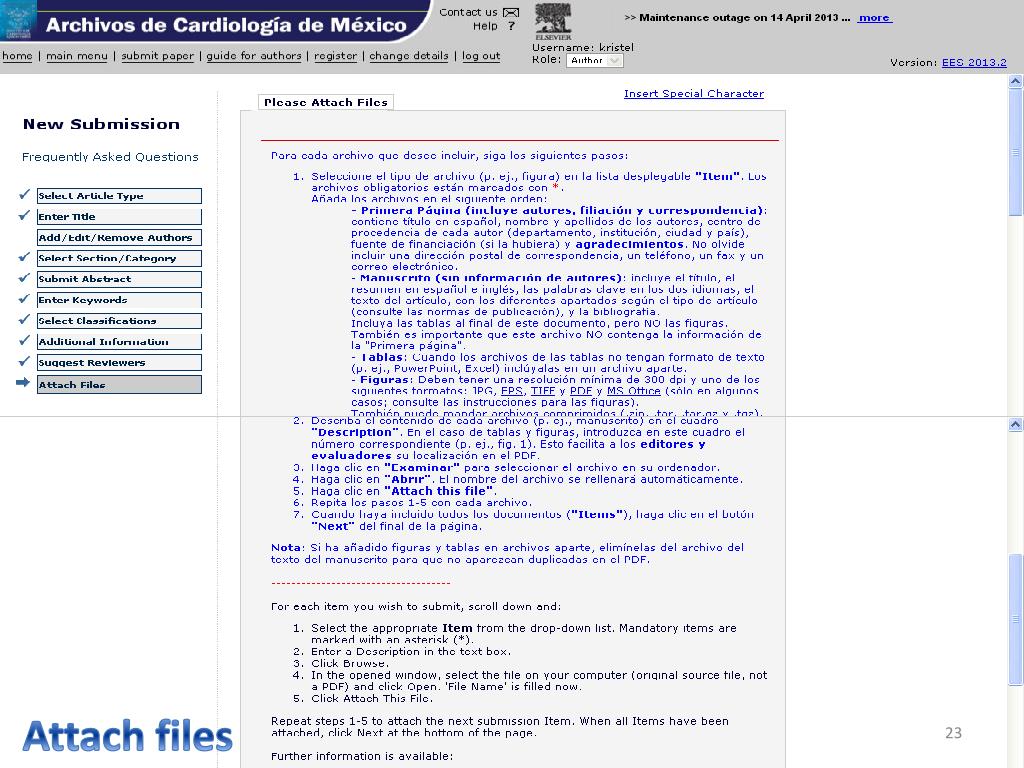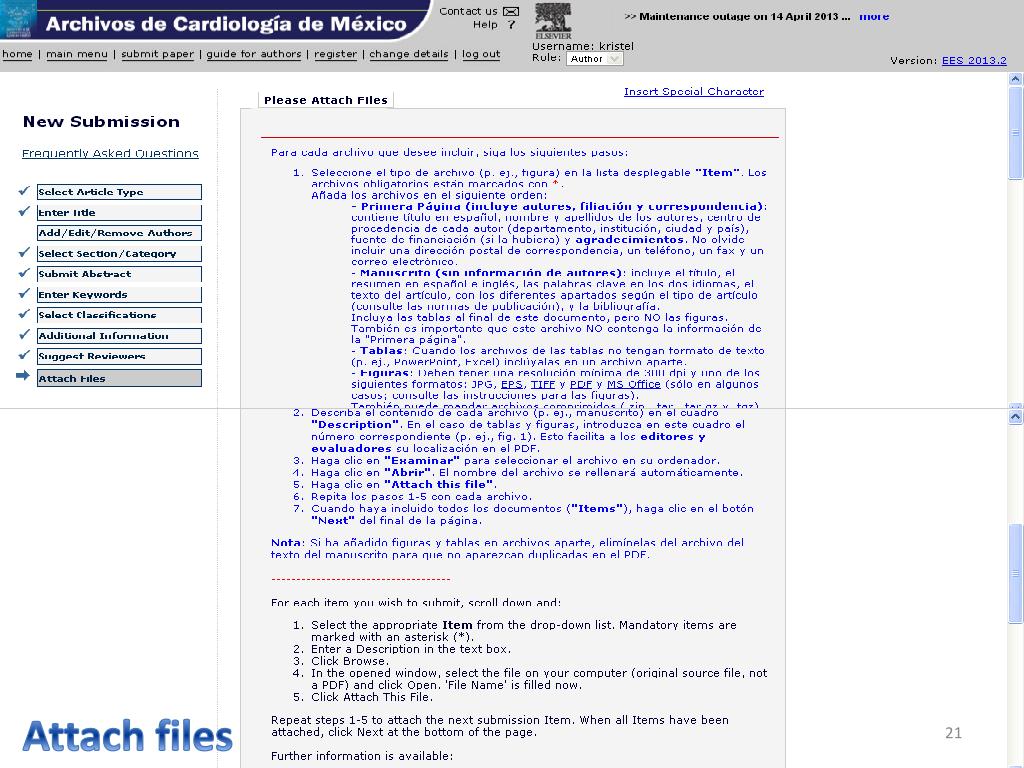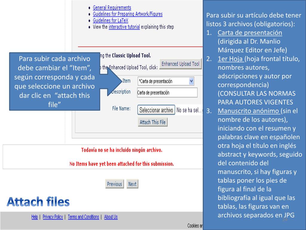 Para subir su artículo debe tener listos 3 archivos (obligatorios): Carta de presentación (dirigida al Dr. Manlio Márquez Editor en Jefe) 1er Hoja (hoja frontal título, nombres autores, adscripciones y autor por correspondencia) (CONSULTAR LAS NORMAS PARA AUTORES VIGENTES Manuscrito anónimo (sin el nombre de los autores), iniciando con el resumen y palabras clave en españolen otra hoja el título en inglés abstract y keywords, seguido del contenido del manuscrito, si hay figuras y tablas poner los pies de figura al final de la bibliografía al igual que las tablas, las figuras van en archivos separados en JPG Para subir cada archivo debe cambiar el “Item”, según corresponda y cada que seleccione un archivo dar clic en “attachthisfile” Attach files