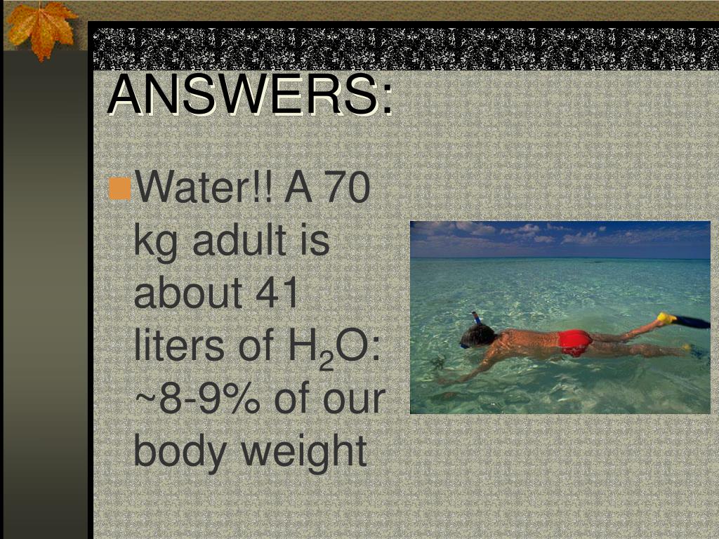 ANSWERS: • Water!! A 70 kg adult is about 41 liters of H2O: ~8-9% of our body weight