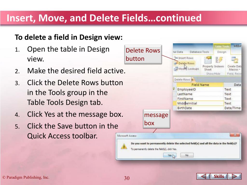 Insert, Move, and Delete Fields…continued To delete a field in Design view: • Open the table in Design view. • Make the desired field active. • Click the Delete Rows button in the Tools group in the Table Tools Design tab. • Click Yes at the message box. • Click the Save button in the Quick Access toolbar. Delete Rows button message box