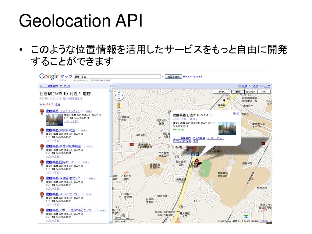 Geolocation API • このような位置情報を活用したサービスをもっと自由に開発することができます