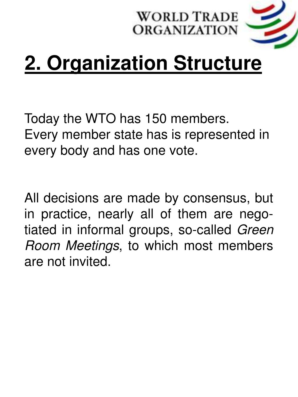 2. Organization Structure Today the WTO has 150 members. Every member state has is represented in every body and has one vote. All decisions are made by consensus, but in practice, nearly all of them are nego-tiated in informal groups, so-called Green Room Meetings, to which most members are not invited.