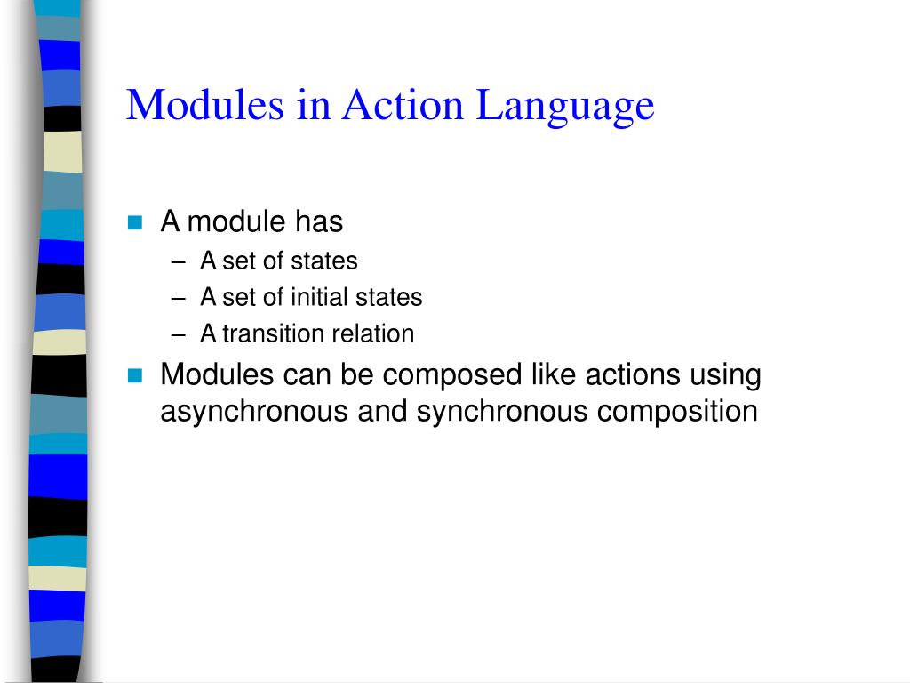 Modules in Action Language • A module has • A set of states • A set of initial states • A transition relation • Modules can be composed like actions using asynchronous and synchronous composition