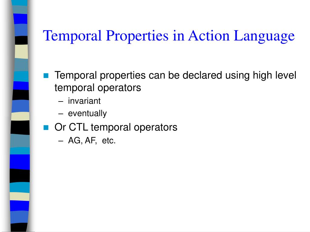 Temporal Properties in Action Language • Temporal properties can be declared using high level temporal operators • invariant • eventually • Or CTL temporal operators • AG, AF, etc.