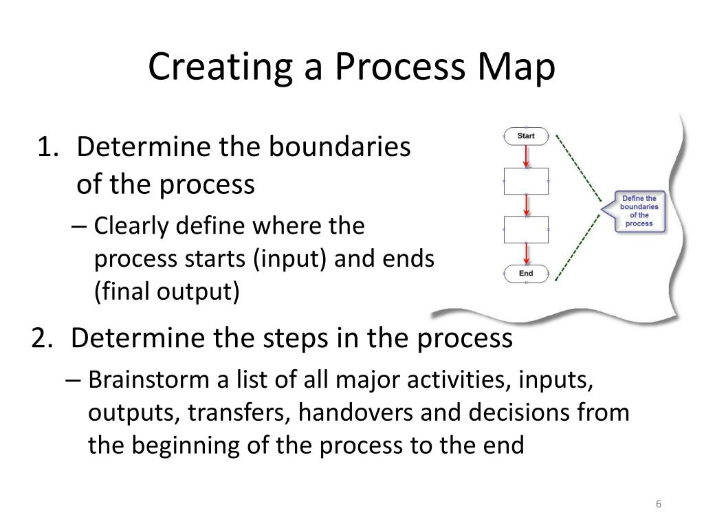 Creating a Process Map • Determine the boundaries of the process • Clearly define where the process starts (input) and ends (final output) • Determine the steps in the process • Brainstorm a list of all major activities, inputs, outputs, transfers, handovers and decisions from the beginning of the process to the end