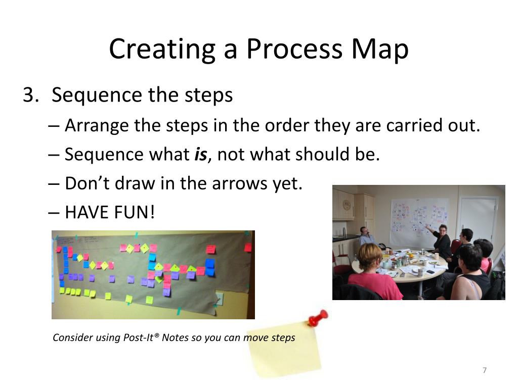 Creating a Process Map • Sequence the steps • Arrange the steps in the order they are carried out. • Sequence what is, not what should be. • Don’t draw in the arrows yet. • HAVE FUN! Consider using Post-It® Notes so you can move steps