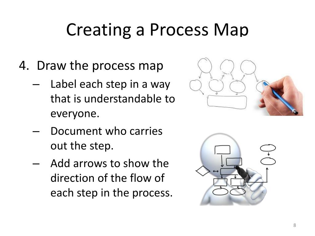 Creating a Process Map • Draw the process map • Label each step in a way that is understandable to everyone. • Document who carries out the step. • Add arrows to show the direction of the flow of each step in the process.