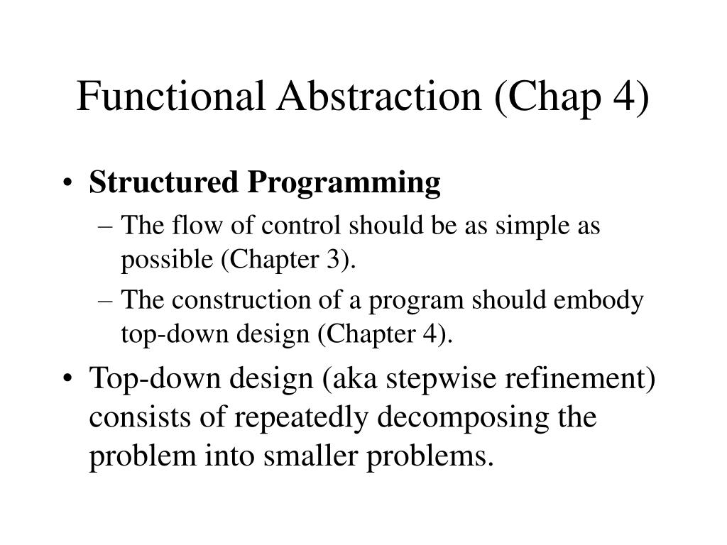 Functional Abstraction (Chap 4). Structured Programming The flow of control should be as simple as possible (Chapter 3). The construction of a program should embody top-down design (Chapter 4).