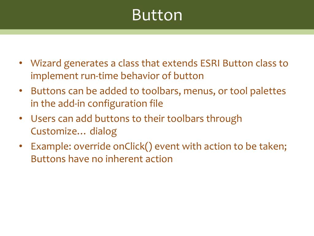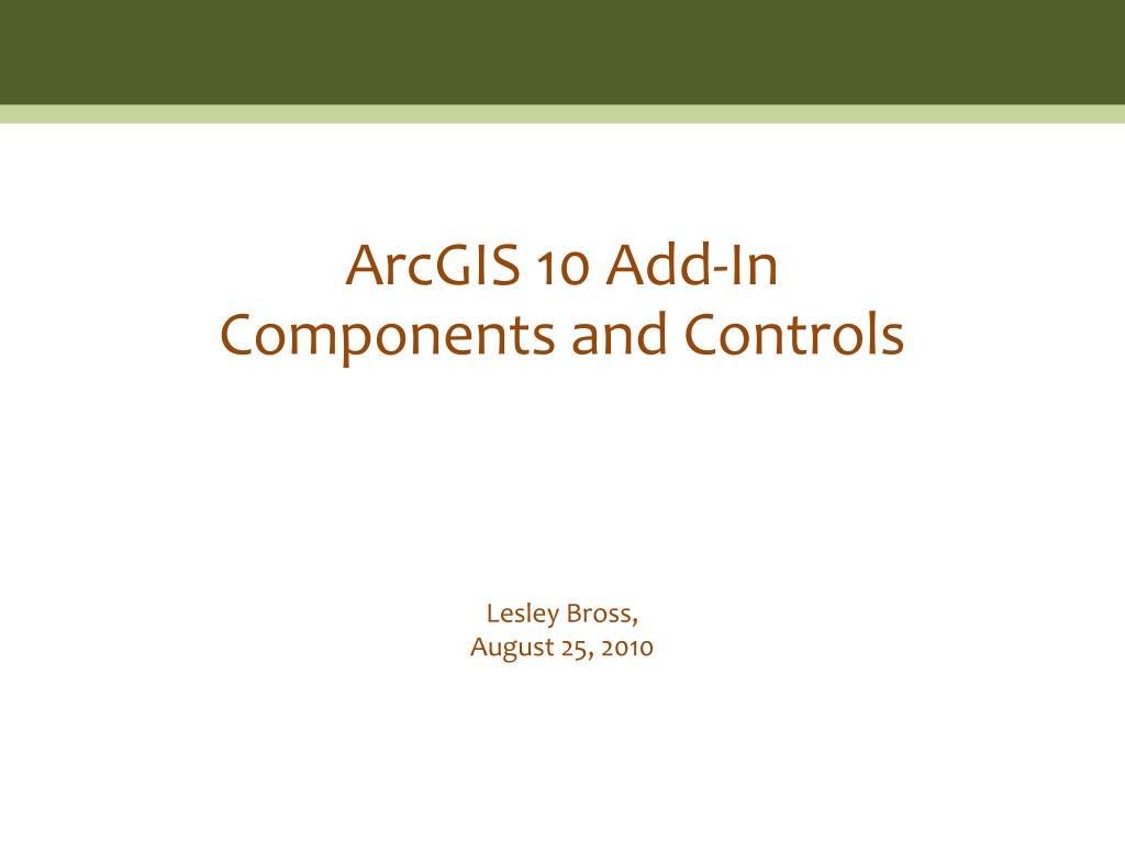 ArcGIS 10 Add-In Components and Controls. Lesley Bross, August 25, 2010. Add-in Components. Button. Wizard generates a class that extends ESRI Button class to implement run-time behavior of button Buttons can be added to toolbars, menus, or tool palettes in the add-in configuration file