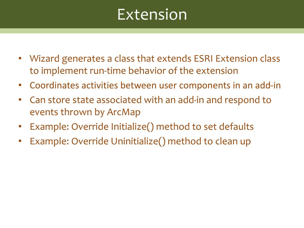Extension • Wizard generates a class that extends ESRI Extension class to implement run-time behavior of the extension • Coordinates activities between user components in an add-in • Can store state associated with an add-in and respond to events thrown by ArcMap • Example: Override Initialize() method to set defaults • Example: Override Uninitialize() method to clean up
