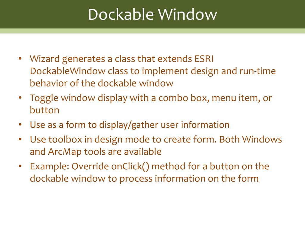 Dockable Window • Wizard generates a class that extends ESRI DockableWindowclass to implement design and run-time behavior of the dockable window • Toggle window display with a combo box, menu item, or button • Use as a form to display/gather user information • Use toolbox in design mode to create form. Both Windows and ArcMap tools are available • Example: Override onClick() method for a button on the dockable window to process information on the form
