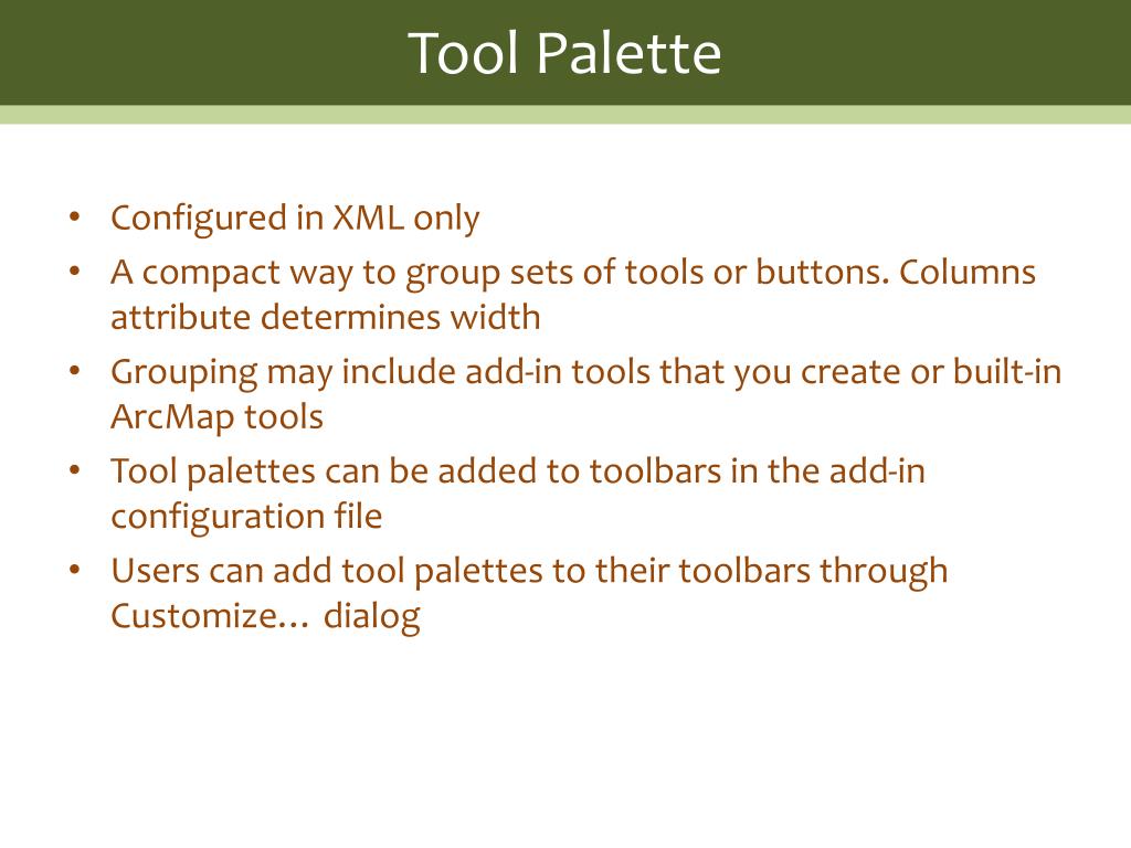 Tool Palette • Configured in XML only • A compact way to group sets of tools or buttons. Columns attribute determines width • Grouping may include add-in tools that you create or built-in ArcMap tools • Tool palettes can be added to toolbars in the add-in configuration file • Users can add tool palettes to their toolbars through Customize… dialog