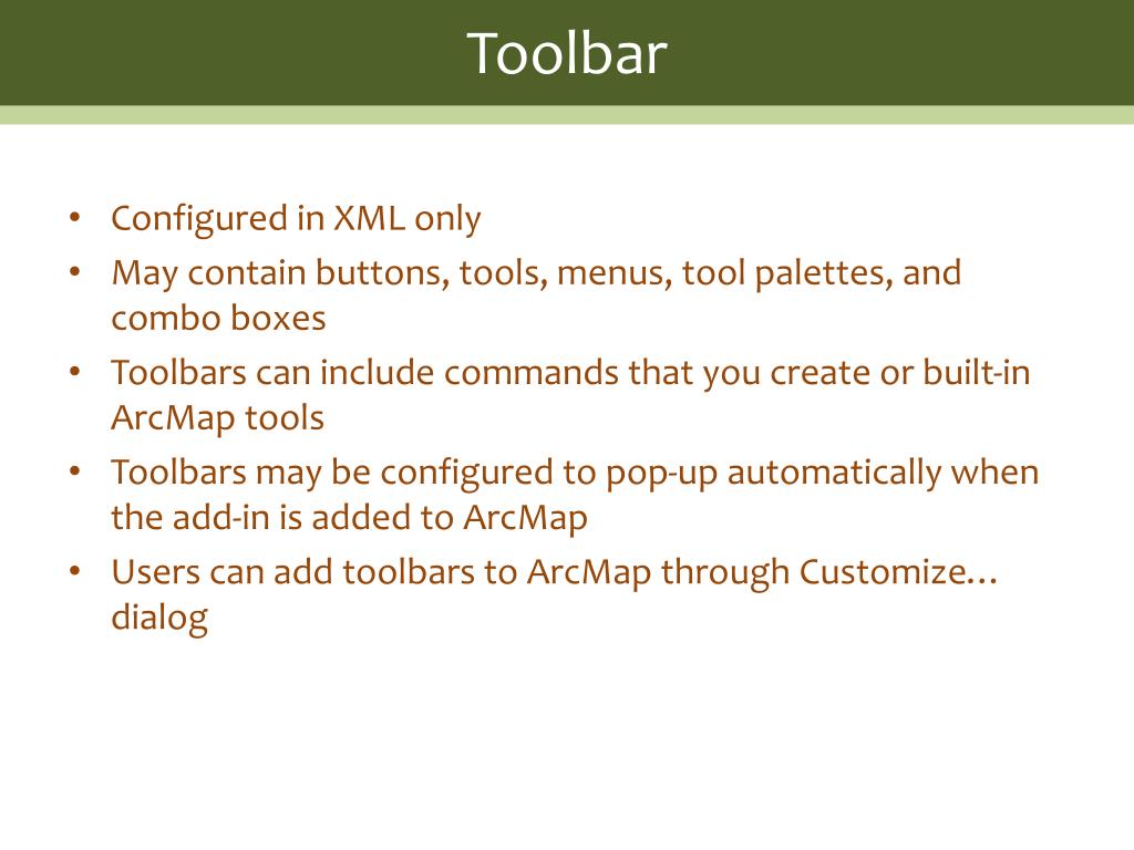 Toolbar • Configured in XML only • May contain buttons, tools, menus, tool palettes, and combo boxes • Toolbars can include commands that you create or built-in ArcMap tools • Toolbars may be configured to pop-up automatically when the add-in is added to ArcMap • Users can add toolbars to ArcMap through Customize… dialog