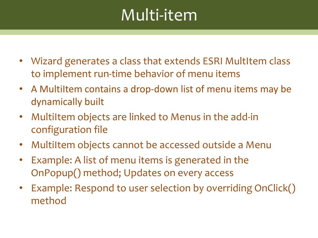 Multi-item • Wizard generates a class that extends ESRI MultItemclass to implement run-time behavior of menu items • A MultiItem contains a drop-down list of menu items may be dynamically built • MultiItem objects are linked to Menus in the add-in configuration file • MultiItem objects cannot be accessed outside a Menu • Example: A list of menu items is generated in the OnPopup() method; Updates on every access • Example: Respond to user selection by overriding OnClick() method