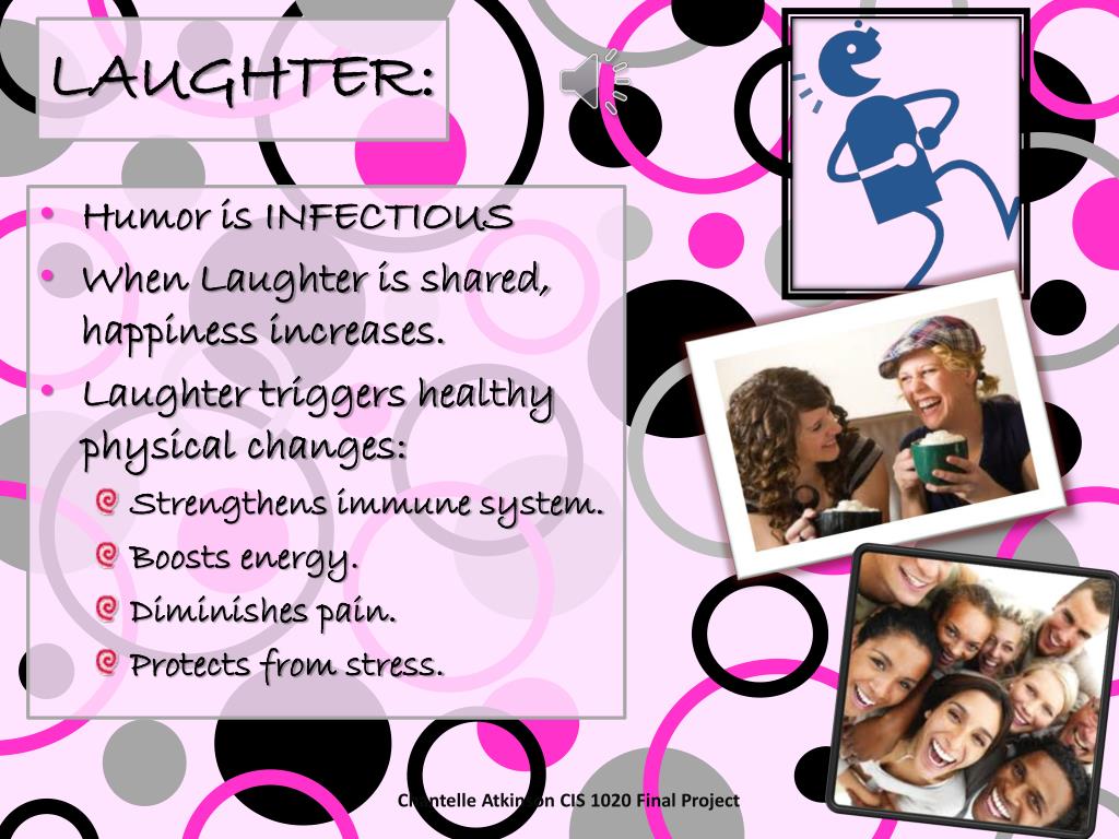 LAUGHTER: • Humor is INFECTIOUS • When Laughter is shared, happiness increases. • Laughter triggers healthy physical changes: • Strengthens immune system. • Boosts energy. • Diminishes pain. • Protects from stress. Chantelle Atkinson CIS 1020 Final Project