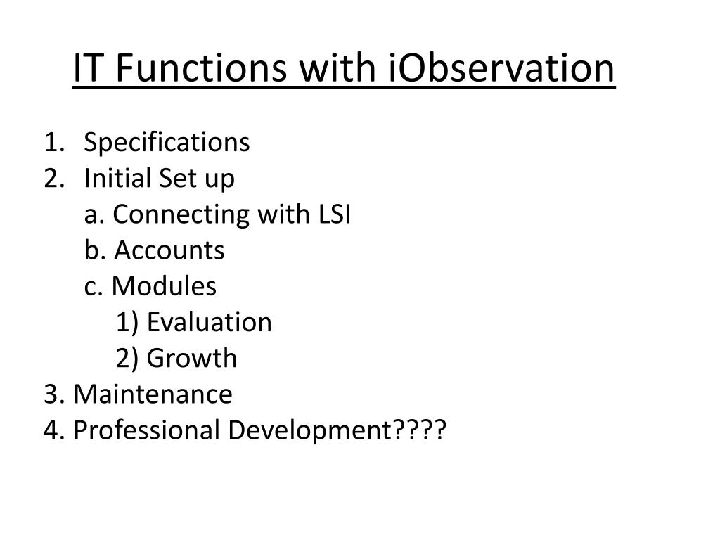 IT Functions with iObservation • Specifications • Initial Set up a. Connecting with LSI b. Accounts c. Modules 1) Evaluation 2) Growth 3. Maintenance 4. Professional Development????
