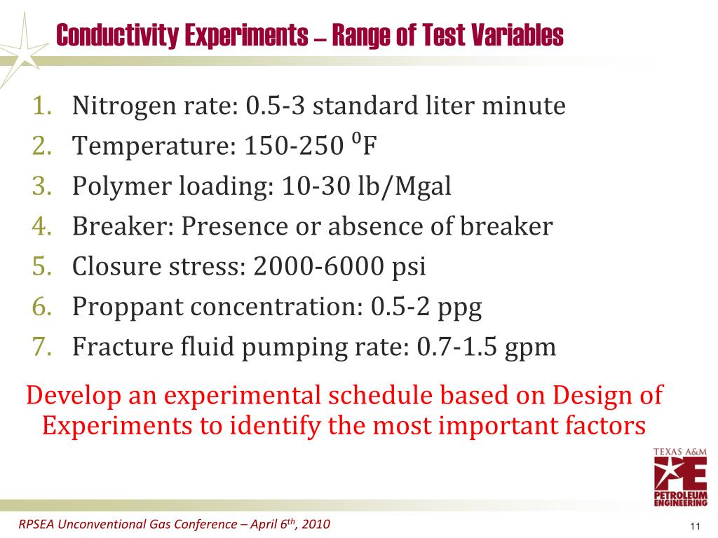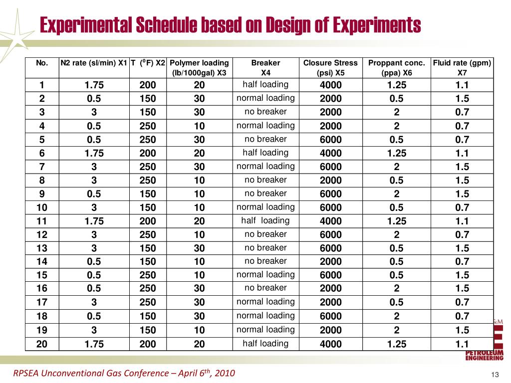 Conductivity Experiments – Range of Test Variables Nitrogen rate: 0.5-3 standard liter minute Temperature: 150-250 ⁰F Polymer loading: 10-30 lb/Mgal Breaker: Presence or absence of breaker Closure stress: 2000-6000 psi Proppant concentration: 0.5-2 ppg Fracture fluid pumping rate: 0.7-1.5 gpm Develop an experimental schedule based on Design of Experiments to identify the most important factors