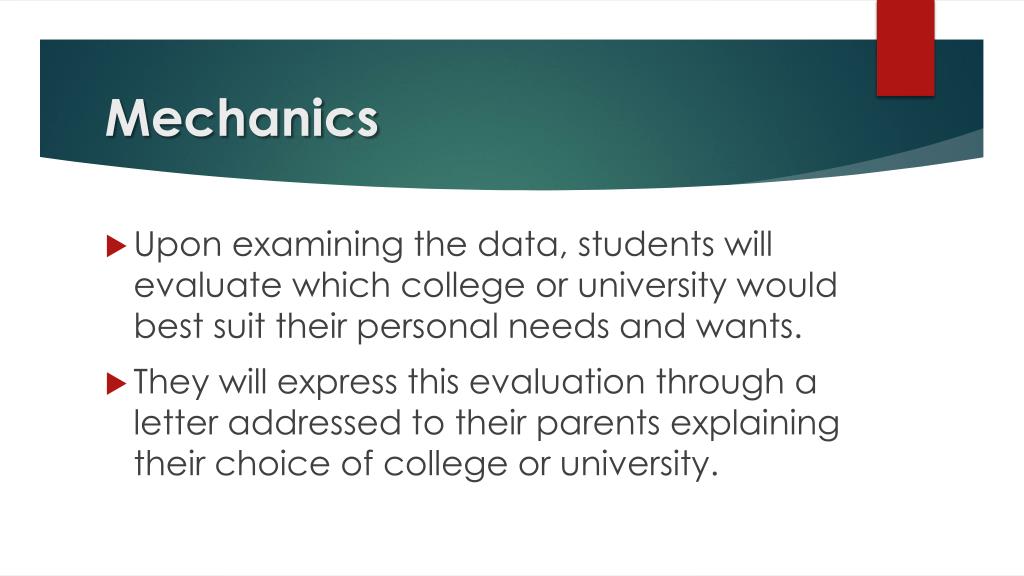 Mechanics • Upon examining the data, students will evaluate which college or university would best suit their personal needs and wants. • They will express this evaluation through a letter addressed to their parents explaining their choice of college or university.