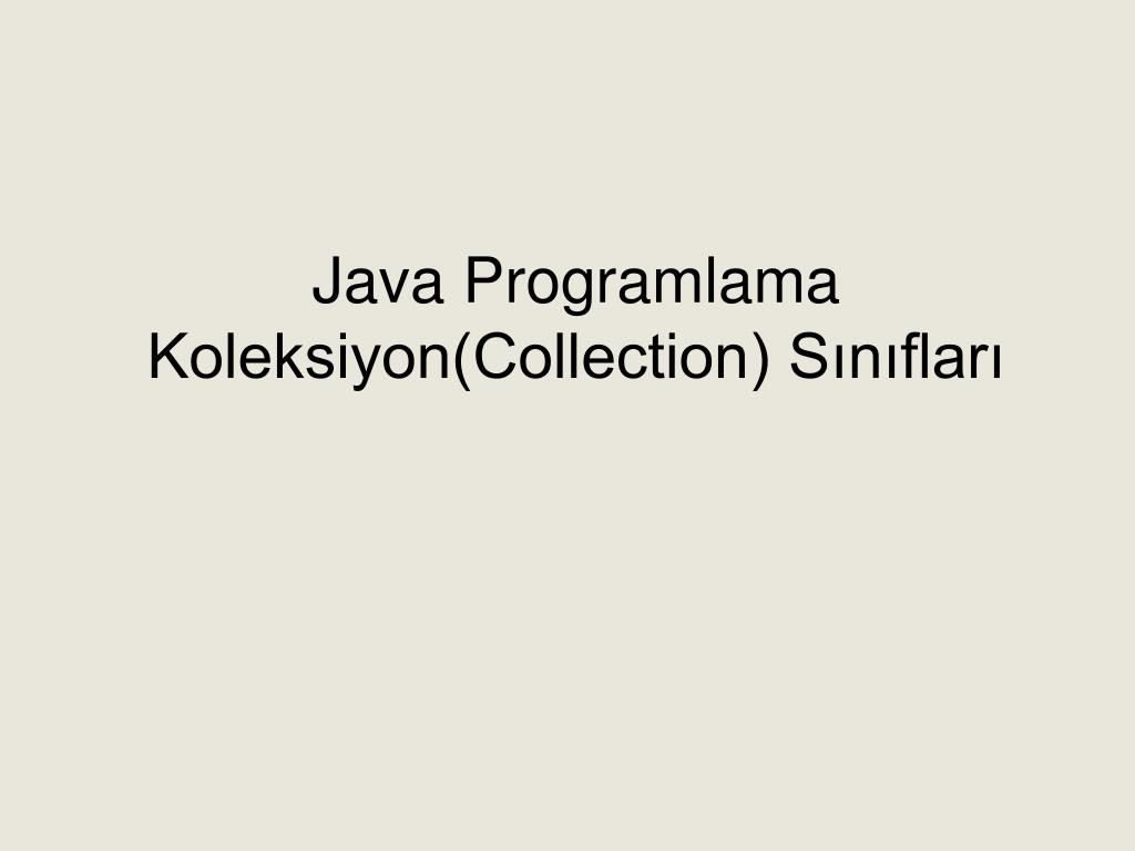 Collection Classes Collection: Bütün collection sınıfları bu ortak arayüzü gerçekleştirir. Collection’ların en genel halini gösterir Set: Aynı elemandan birden fazla içermeyen collection. Matematikdeki “küme” kavramını gösterir arayüz. List: Elemanların sıralı yer aldığı collection. Aynı elemandan birden fazla içerebilir. Liste kavramını gösterir arayüz. Queue: Kuyruk kavramını gösterir arayüz. Standart Collection arayüzü dışında ek metodlar içerir. Map: Anahtarları elemanlara eşleştiren bir yapı arayüzü. Tekrarlı anahtarlar içeremez. SortedSet: Sıralı küme arayüzü. Bu arayüzü gerçekleştiren yapıda elemanlar artan değerlerde sıralı tutulurlar. SortedMap: Bu arayüzü gerçekleştiren sınıfta anahtar değerleri sıralı olarak tutulur.