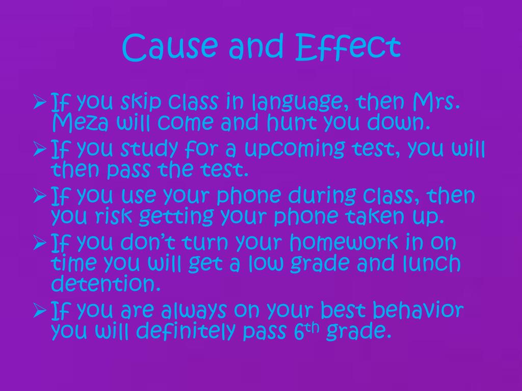 Cause and Effect • If you skip class in language, then Mrs. Meza will come and hunt you down. • If you study for a upcoming test, you will then pass the test. • If you use your phone during class, then you risk getting your phone taken up. • If you don’t turn your homework in on time you will get a low grade and lunch detention. • If you are always on your best behavior you will definitely pass 6th grade.