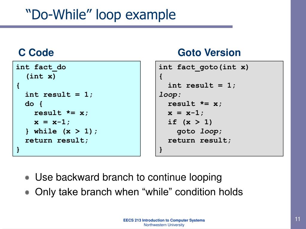 Is this code equivalent to the do-while version? Must jump out of loop if test fails “While” loop example #1 First Goto Version C Code int fact_while (int x) { int result = 1; while (x > 1) { result *= x; x = x-1; }; return result; } int fact_while_goto (int x) { int result = 1; loop: if (!(x > 1)) goto done; result *= x; x = x-1; goto loop; done: return result; } EECS 213 Introduction to Computer SystemsNorthwestern University