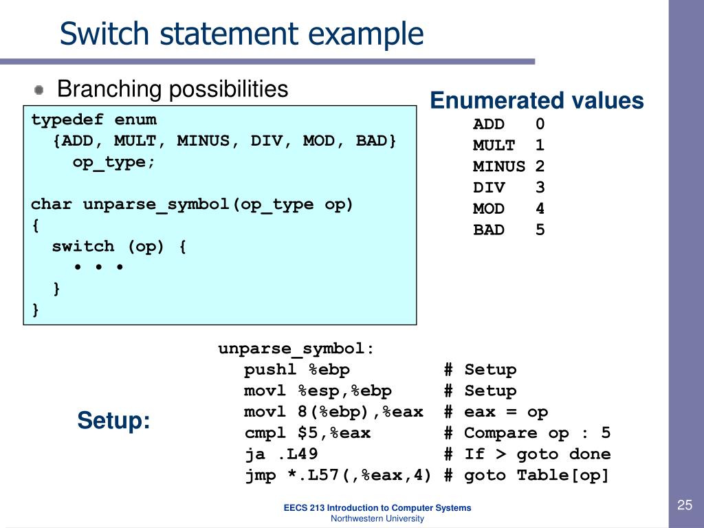 Implementation options Series of conditionals Good if few cases Slow if many Jump table Lookup branch target Avoids conditionals Possible when cases are small integer constants GCC Picks one based on case structure Bug in example code No default given Switch statements (IONUT STOPPED HERE) typedef enum {ADD, MULT, MINUS, DIV, MOD, BAD} op_type; char unparse_symbol(op_type op) { switch (op) { case ADD : return '+'; case MULT: return '*'; case MINUS: return '-'; case DIV: return '/'; case MOD: return '%'; case BAD: return '?'; } } EECS 213 Introduction to Computer SystemsNorthwestern University