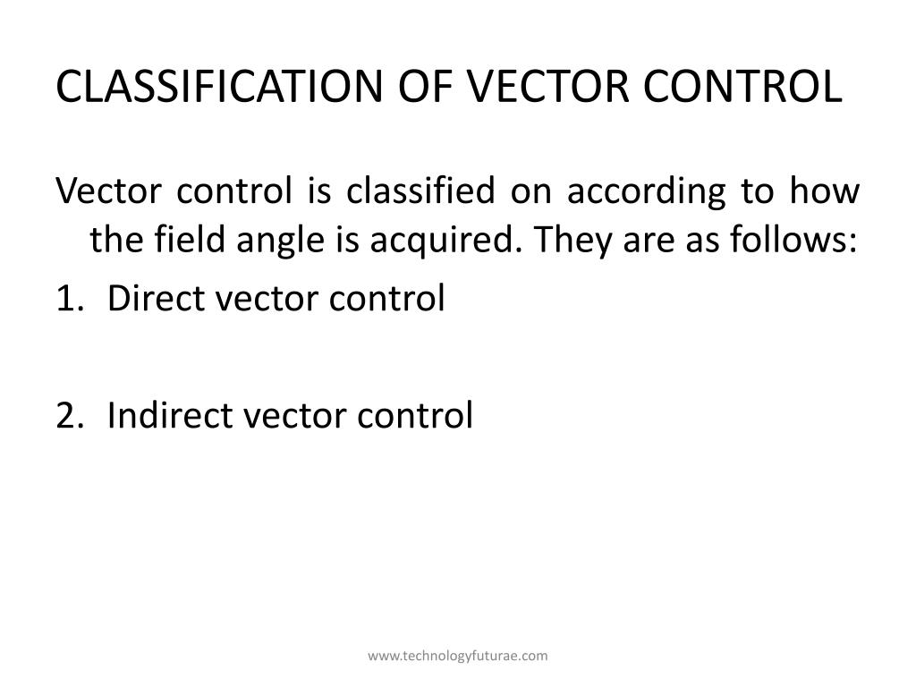 Classification of vector control Vector control is classified on according to how the field angle is acquired. They are as follows: • Direct vector control • Indirect vector control www.technologyfuturae.com