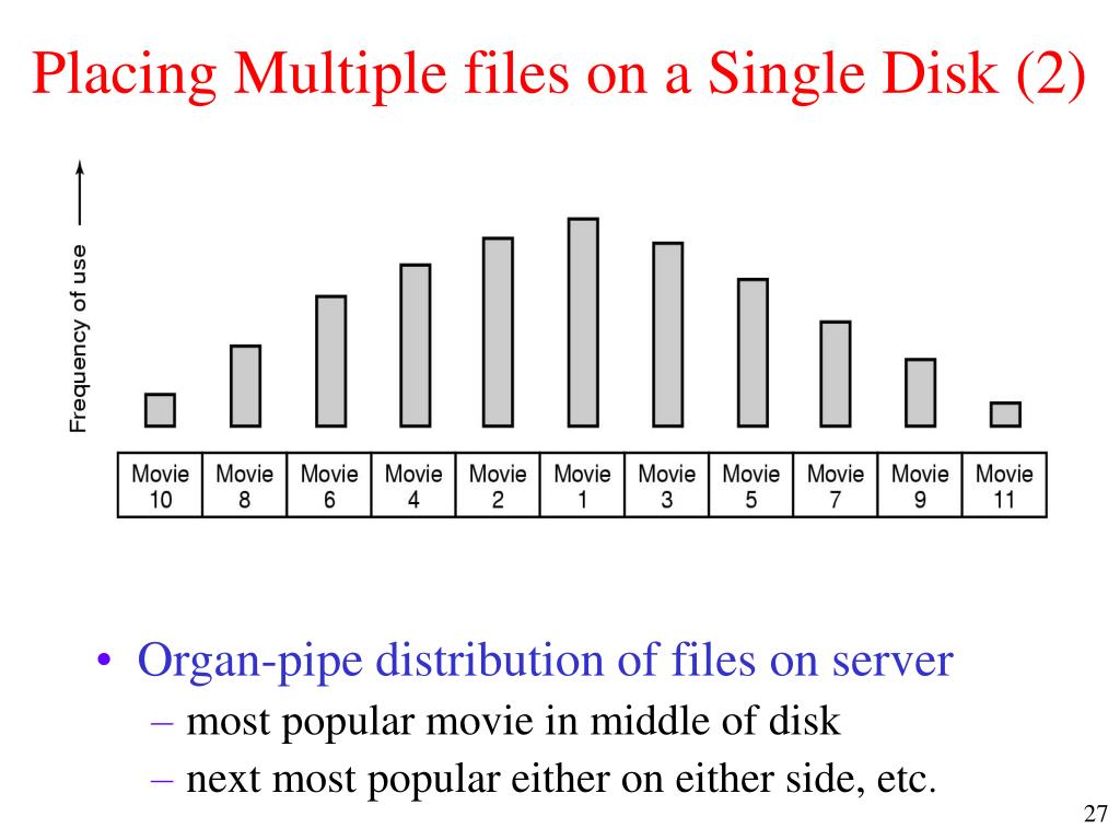 Placing Multiple files on a Single Disk (2) • Organ-pipe distribution of files on server • most popular movie in middle of disk • next most popular either on either side, etc.