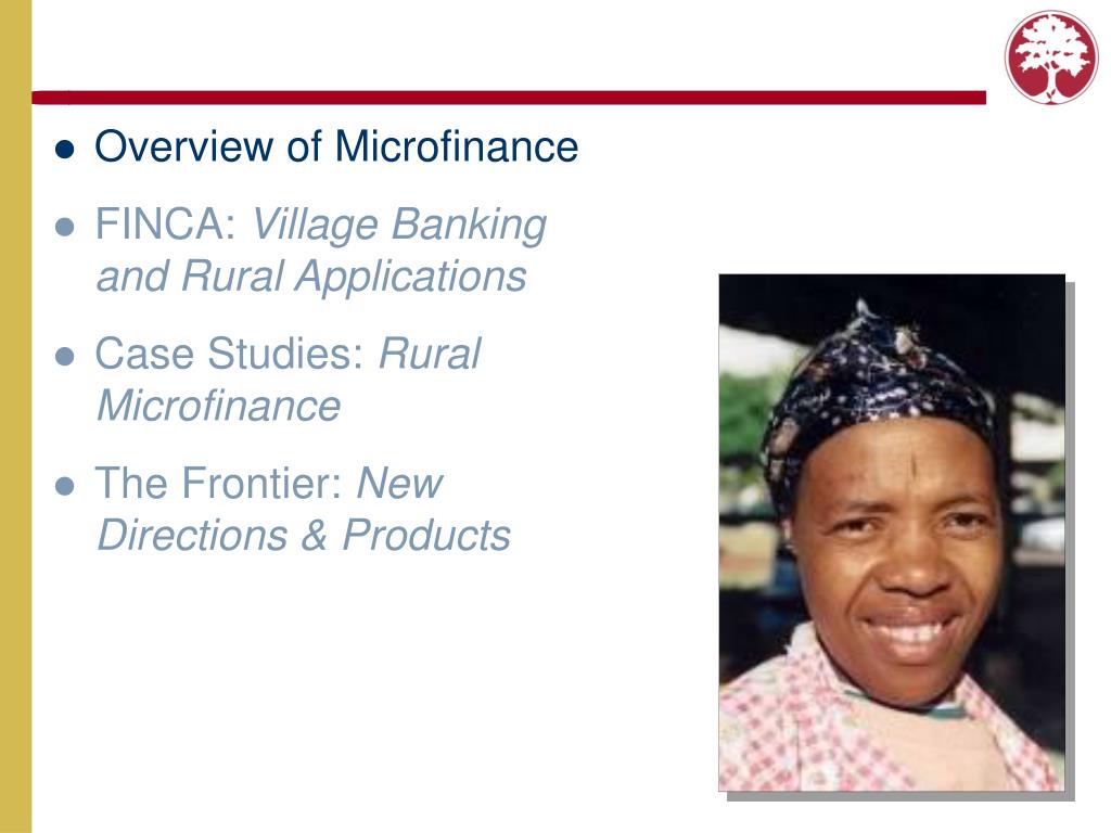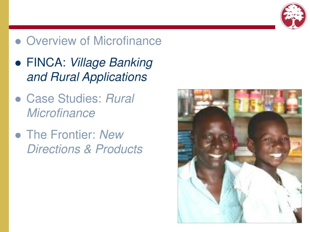 Overview of Microfinance • FINCA: Village Banking and Rural Applications • Case Studies: Rural Microfinance • The Frontier: New Directions & Products